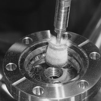 真空チャンバーの内部。このような複雑な形状における溶接と研磨の美しい技術は⼈の⼿からしか⽣まれません。