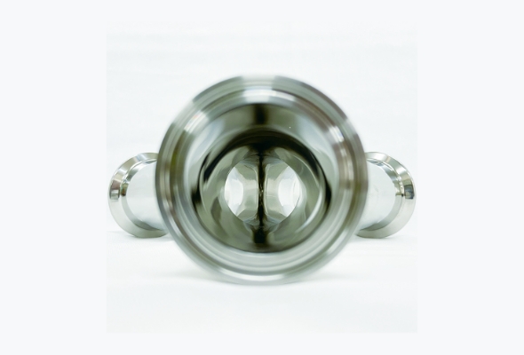 真空チャンバーの内部。このような複雑な形状における溶接と研磨の美しい技術は⼈の⼿からしか⽣まれません。